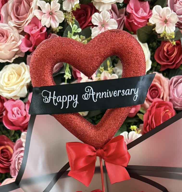 Red foam heart with ribbon (flowers not included) with short quote of your choosing. Ex: "Happy Birthday", "Happy Anniversary", "I Love You"...